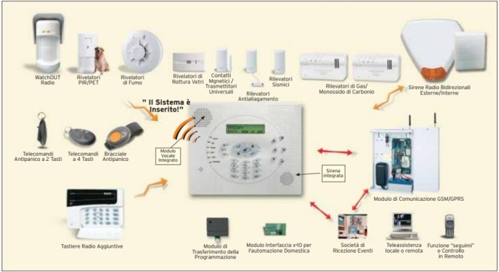 La centrale di allarme è anche compatibile con una vasta gamma di accessori di sicurezza e di utilità quali tastiere, modulo GSM (per invio e ricezione tramite sms), radar interni ed esteri volumetrici e effetto tenda perimetrali, contatti tapparella, radar volumetrici immuni ad animali domestici, sirena con contenitore antivandalico antischiuma incorporato etc.
